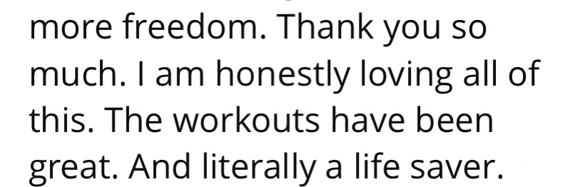 “I am honestly loving all of this. The workouts have been great. And literally a life saver..”